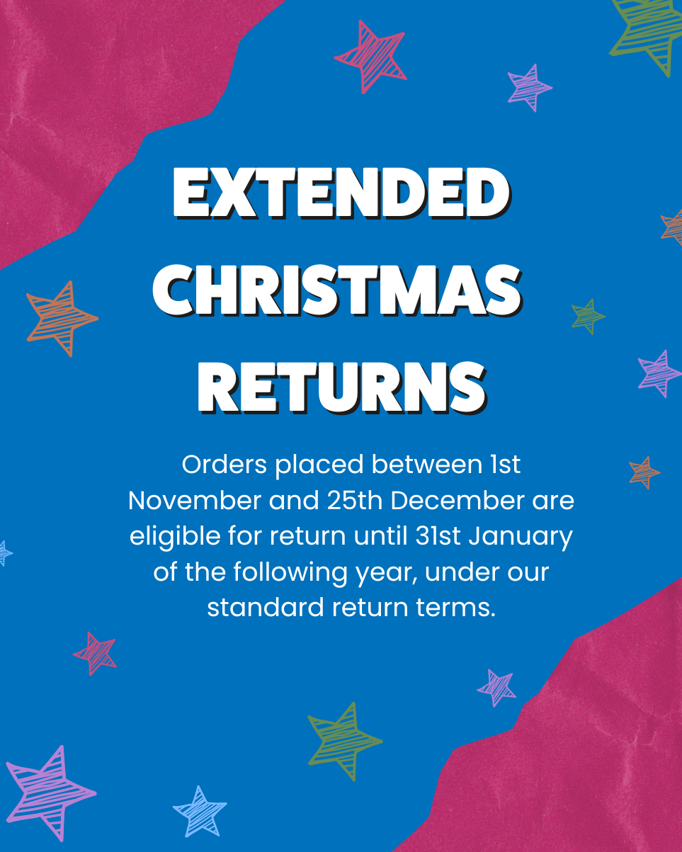 Shopping early? All orders from 1st Nov to 25th Dec come with Extended Returns for stress-free gifting.